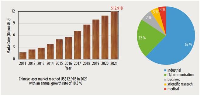 中國(guó)激光市場(chǎng)是世界上最大的工業(yè)激光市場(chǎng)?;仡?020年,中國(guó)激光產(chǎn)業(yè)全年實(shí)現(xiàn)了10個(gè)百分點(diǎn)的正增長(zhǎng),遠(yuǎn)遠(yuǎn)超出預(yù)期,2021中國(guó)激光產(chǎn)業(yè)繼續(xù)保持增長(zhǎng)趨勢(shì)。2021,該國(guó)激光設(shè)備市場(chǎng)的總體規(guī)模同比增長(zhǎng)18.3%,達(dá)到創(chuàng)紀(jì)錄的129億美元(圖1)。在中國(guó)從舊的低技術(shù)產(chǎn)業(yè)向新的高技術(shù)產(chǎn)業(yè)轉(zhuǎn)型的過(guò)程中,激光技術(shù)的應(yīng)用已成為許多制造業(yè)提高產(chǎn)品質(zhì)量、降低成本、最終提高競(jìng)爭(zhēng)力的關(guān)鍵。