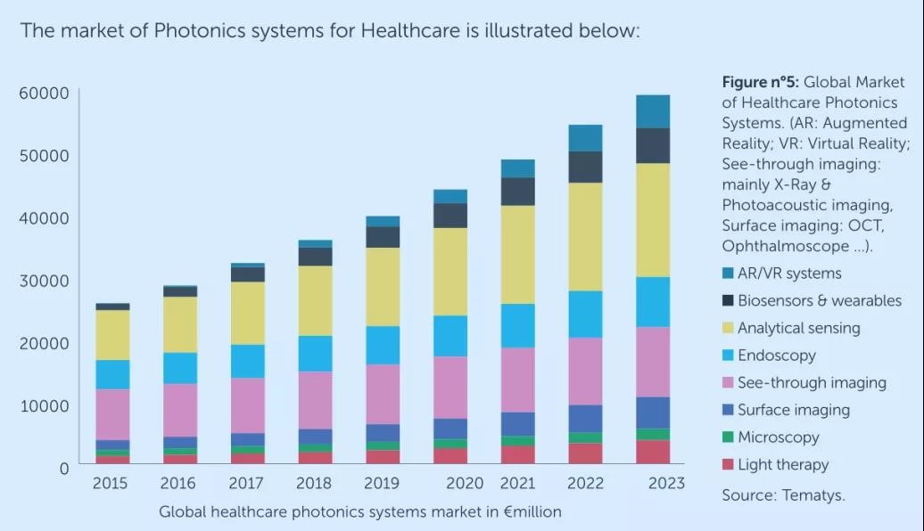 預(yù)計(jì)到2023年,全球醫(yī)療光子技術(shù)將達(dá)到600億歐元左右,如圖1所示,這使其不僅成為光電子領(lǐng)域最大的市場之一,也是全球增長速度更快的行業(yè)之一。