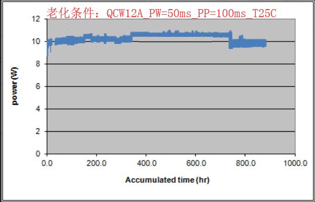 圖2:808nm 190μm發(fā)光區(qū)域?qū)挾取?mm腔長(zhǎng)的芯片,封裝為COS后在10W連續(xù)輸出功率下的長(zhǎng)期老化測(cè)試情況, 7個(gè)COS器件的老化時(shí)間累計(jì)超過2.8萬器件小時(shí),無器件失效而且功率穩(wěn)定。