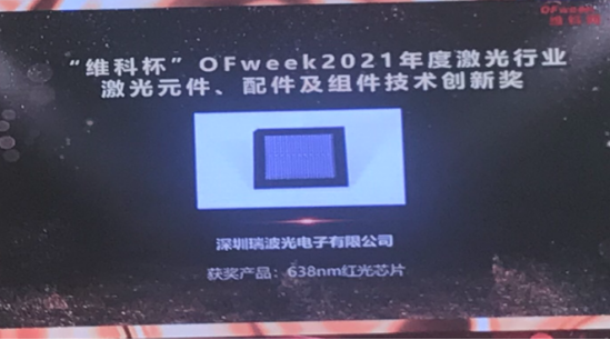2021年9月24日,OFweek Laser Awards 2021行業(yè)年度頒獎(jiǎng)盛典在深圳大中華喜來登酒店舉行。瑞波光電憑借開發(fā)的大功率638nm紅光芯片成功贏得“OFWEEK激光元件、配件及組件技術(shù)創(chuàng)新獎(jiǎng)”。