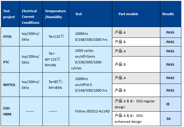 為了滿足客戶對(duì)車規(guī)級(jí)品質(zhì)的要求,并回答COB方式封裝的905nm EEL裸芯片能否符合AEC-Q102的可靠性要求,瑞波希望以芯片供應(yīng)商的角度對(duì)整機(jī)廠商在905nm EEL裸芯片的封裝和使用方面提供指導(dǎo)意見。根據(jù)散熱、給電等共性特點(diǎn),瑞波以T0-56封裝形式來(lái)模擬COB封裝,并籌劃了AEC-Q102里的HTOL、PTC、WHTOL、ESD-HBM4 四個(gè)最關(guān)鍵的測(cè)試項(xiàng)目,花費(fèi)一年時(shí)間完成了兩個(gè)芯片產(chǎn)品的測(cè)試,測(cè)試結(jié)果為合格(表1、圖1、圖2)。兩個(gè)芯片產(chǎn)品發(fā)光面的節(jié)數(shù)是3節(jié)和4節(jié),功率密度分別為41KW/mm2(產(chǎn)品A)和42KW/mm2(產(chǎn)品B)。特別要指出的是,在高溫高濕的WHTOL項(xiàng)目里,測(cè)試的TO器件是去掉玻璃窗口的,芯片是直接和環(huán)境接觸的。順利通過AEC-Q102里的WHTOL測(cè)試項(xiàng)目說(shuō)明瑞波905nm EEL芯片產(chǎn)品可以在非氣密封裝的環(huán)境里可靠工作。非氣密封裝意味可以大幅降低激光雷達(dá)整機(jī)的封裝成本。在AEC-Q102測(cè)試項(xiàng)目以外,瑞波還積累了近50萬(wàn)器件小時(shí)的長(zhǎng)期壽命測(cè)試數(shù)據(jù),以此數(shù)據(jù)建立的壽命模型預(yù)測(cè)器件的平均壽命超過100萬(wàn)小時(shí)。