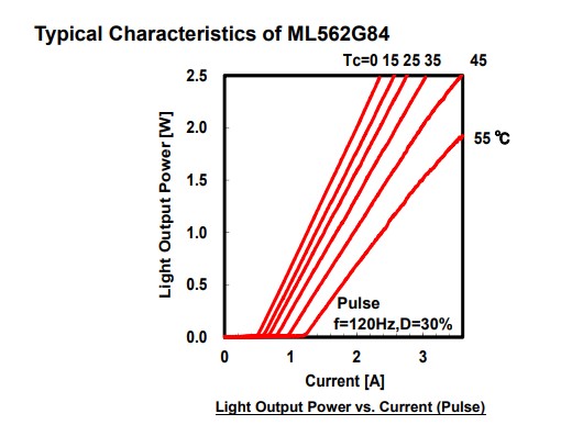 圖1三菱2.5 W 638 nm 半導(dǎo)體激光器(型號(hào)ML562G84)功率電流曲線(脈沖)