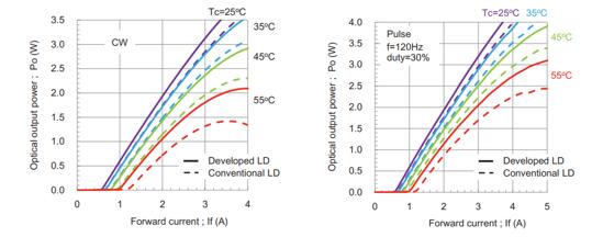 三菱于2009年發(fā)布用于彩色投影儀的638 nm半導(dǎo)體激光器,而后其輸出功率也在不斷突破,2010年推出連續(xù)工作功率500 mW產(chǎn)品, 2014年采用雙發(fā)光點(diǎn)將連續(xù)輸出功率提升至1.8W,2015年將發(fā)光點(diǎn)個(gè)數(shù)增加至3個(gè),使脈沖輸出功率達(dá)到2.5W(ML562G84脈沖紅色大功率半導(dǎo)體激光器,性能見圖1)。2018年12月發(fā)布脈沖輸出功率3.0W產(chǎn)品- ML562G86(2019年4月正式發(fā)布),成為當(dāng)年所報(bào)道的638 nm波段激光器中功率最高的半導(dǎo)體激光器[8],自此以后,三菱再無(wú)638nm新品推出。
