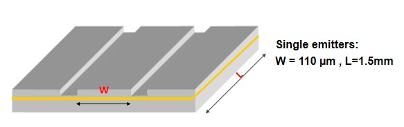 其中1 W 638 nm芯片采用110 μm發(fā)光條寬,腔長(zhǎng) 1.5 mm的尺寸結(jié)構(gòu)(見圖3),而2.5W 638nm芯片則采用三個(gè)發(fā)光點(diǎn),每個(gè)發(fā)光點(diǎn)條寬為60μm、腔長(zhǎng)1.5mm的尺寸結(jié)構(gòu)(見圖4)。