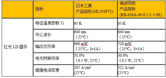 瑞波與三菱紅光芯片性能參數(shù)對(duì)比表(1.5 mm腔長(zhǎng), 40 μm條寬)