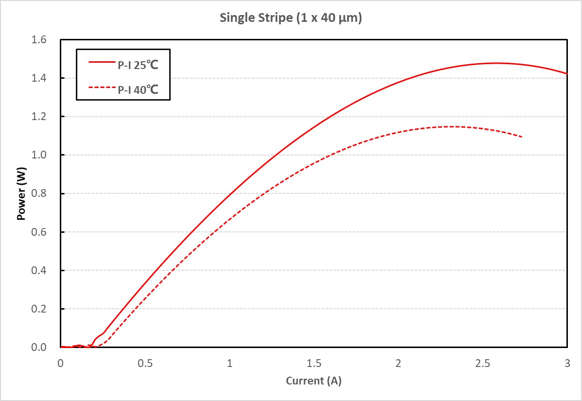 圖 5(b) 1W 638nm芯片在T=25℃和40℃、連續(xù)電流下P-I曲線