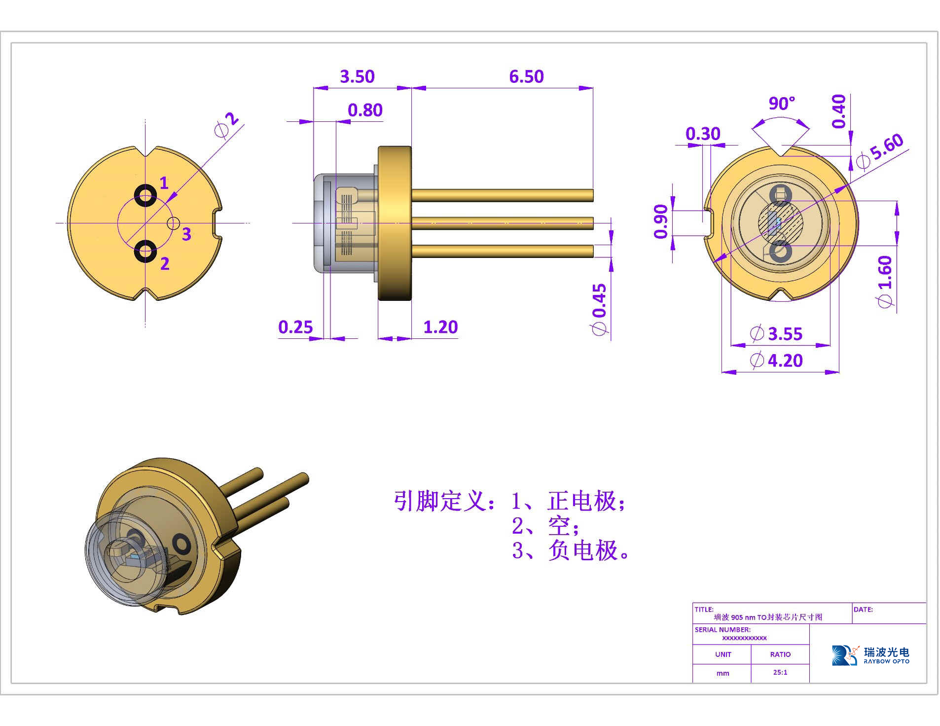 深圳瑞波光電子有限公司針對公司旗下的905nm芯片系列提供TO金屬封裝,具有散熱好、性價比高、可靠性好的優(yōu)點(diǎn)。